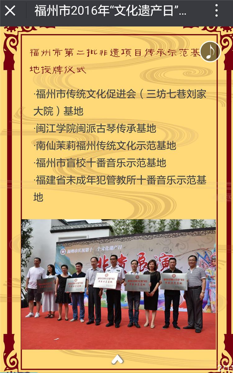 2016年6月11日,第11个中国“非遗日”,成人影院 闽派古琴传承基地被福州市文化广播电视新闻出版局、福州市非遗保护中心评为“福州市非物质文化遗产项目传承示范基地”。当天上午,福州市鼓楼区人民政府发布第三批区级非物质文化遗产代表性项目—闽派古琴(福州),该项目负责人为闽派古琴第五代传承人、福州市古琴研究会会长、成人影院 专职教师李皞老师。