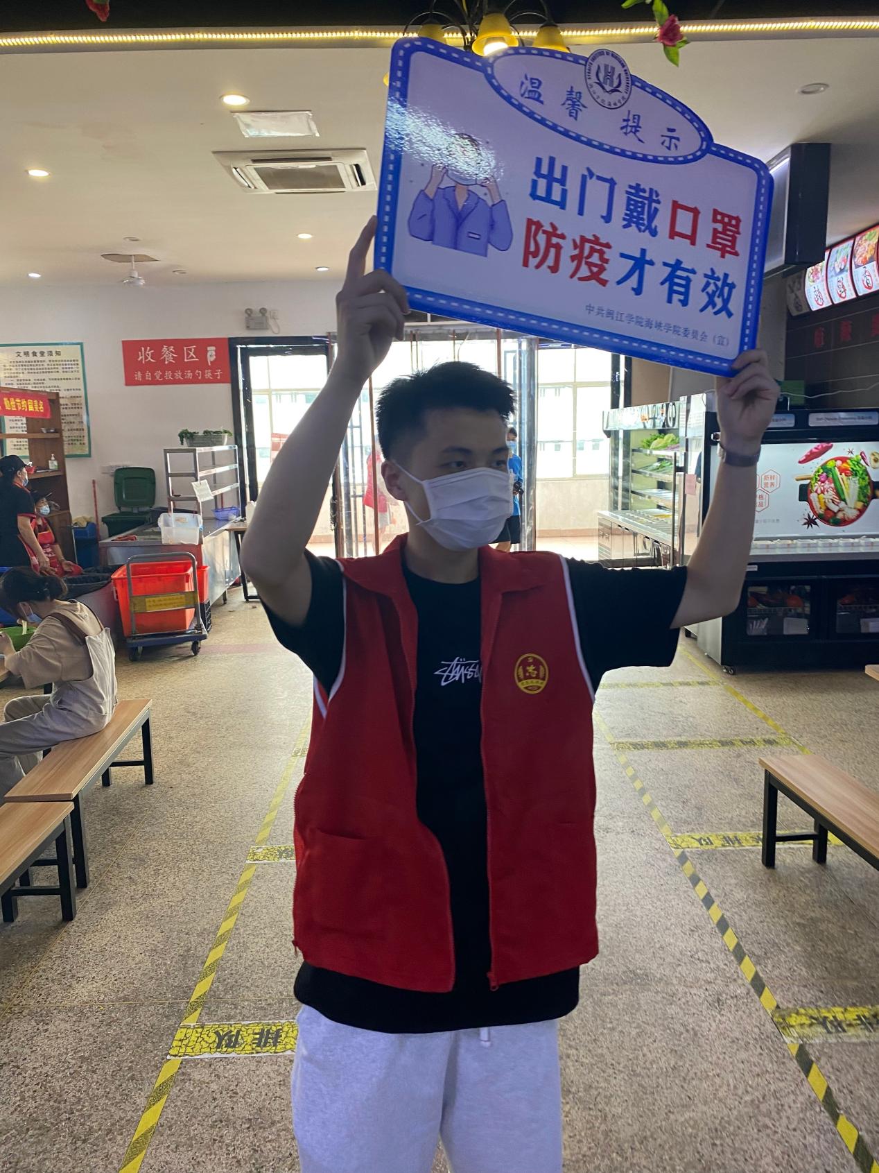 近日,在学院党委的统筹安排下,各学生党支部开展“抗‘疫’有我,‘疫’不容辞”志愿服务活动。“您好,请佩戴口罩,保持安全距离哦。”学生党员志愿者身穿红色马甲,在宿舍楼、食堂等公共场所轮流值守,提醒师生佩戴好口罩,加强个人卫生防护,提升疫情防控意识。