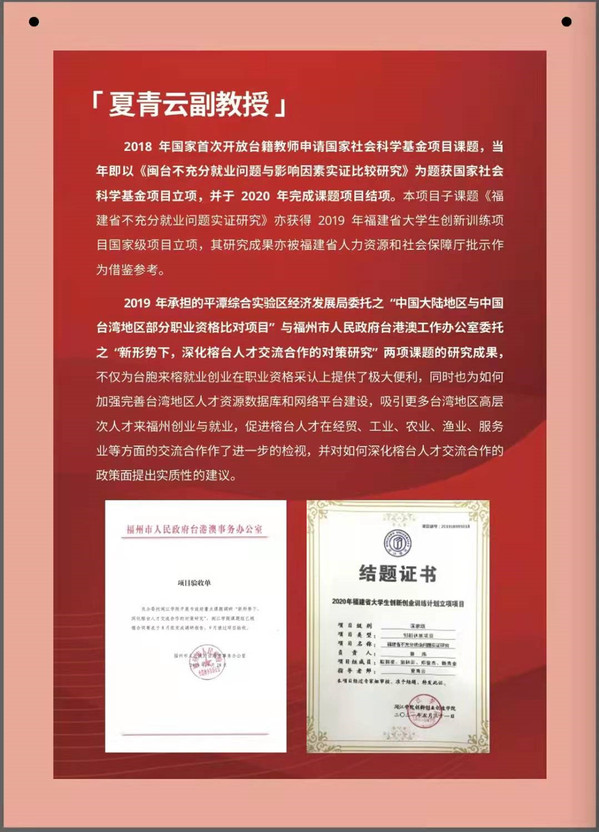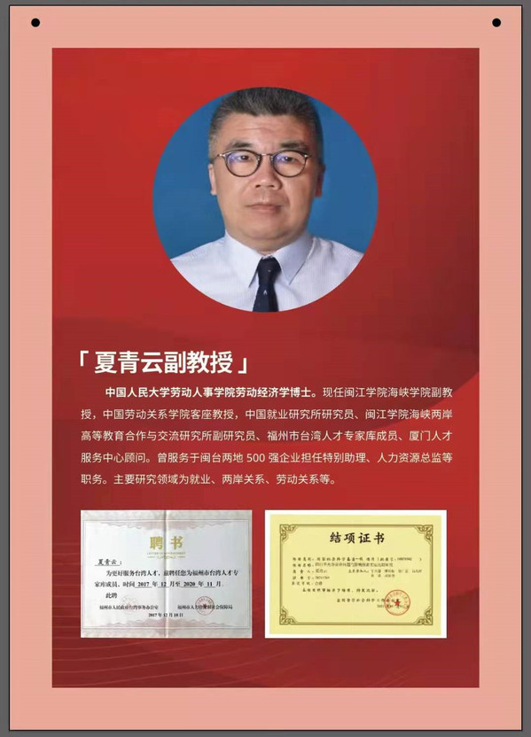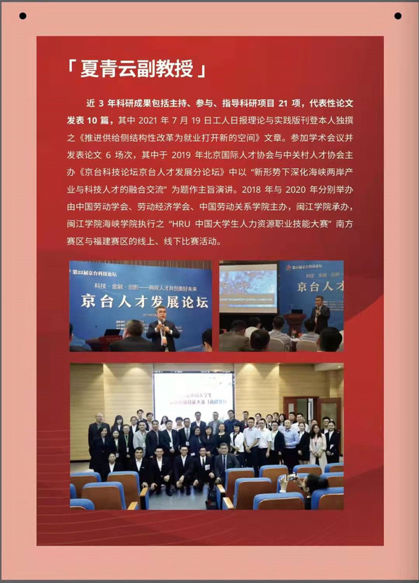 夏青云博士现为成人影院 副教授,中国劳动关系学院客座教授,曾服务于闽台两地500强企业并担任特别助理、人力资源总监等职务,主要致力于就业、两岸关系、劳动关系等领域的研究。2018年,国家首次开放台籍教师申请国家社会科学基金项目课题,其《闽台不充分就业问题与影响因素实证比较研究》课题即获国家社会科学基金项目立项,并顺利结项;2019年,夏青云受平潭综合实验区经济发展局委托承担了“中国大陆地区与中国台湾地区部分职业资格比对项目”,以及受福州市人民政府台港澳工作办公室委托承担了“新形势下,深化榕台人才交流合作的对策研究”两项课题的研究。近三年主持、参与、指导科研项目21项,发表代表性论文10篇,且在组织开展“HRU 中国大学生人力资源职业技能大赛”,以及指导学生参与各类创新创业赛事方面不遗余力,并取得了良好的成绩。