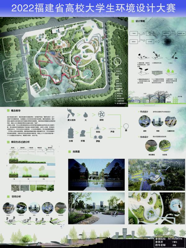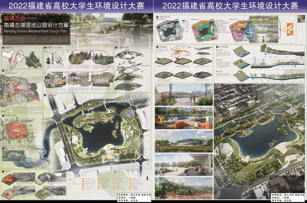 大赛经过现场评选,共产生拟获奖作品342件,其中:金奖44件,银奖64件,铜奖111件,优秀奖123件;成人影院 送审20件作品,经过激烈角逐,共有13件作品获奖。其中,丁鸿楠的作品《基于南靖县兰花文化下的城市湿地公园景观设计》获得金奖,指导老师纪任铨;丁馨怡同学的作品《重塑与新生——福清东张镇文化生态公园景观设计》获得银奖,指导老师梁畅;朱正睿、方丽丽、黄江豪、唐梓杰、杨灿延五位同学获得铜奖,指导老师分别为高东东、高屹、纪任铨、何韶锋、高屹;郭浙闽、黄珮涵、刘丹妮、沈立中、于璐欣、刘海龙六位同学获得优秀奖,指导老师分别为梁畅、高东东、严世宏、何春玲、纪任铨、黄煜、金明润。