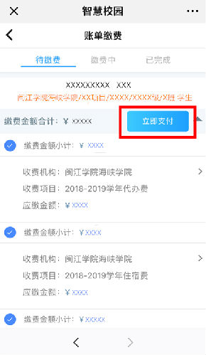 第五步:核对账单信息,勾选应缴账单,确认无误后点击“立即支付”。可勾选多个项目进行合并支付,也可逐项进行支付。