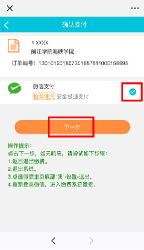 第七步:勾选微信支付,点击下一步,按照提示完成付款。