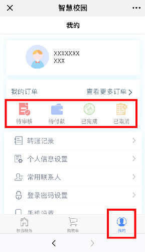 第八步:完成付款后,可回到智慧校园主页面,在右下角“我的”里查询缴费状态。
