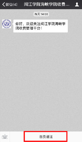 第二步:关注微信公众号后通过点击“缴费通道”进入智慧校园主页。