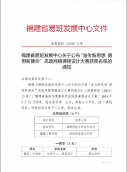 2019年4月12日,福建省易班共建高校思政网络课程设计大赛历时三个多月正式结束。经专家评审、公示,共有6个单位、21个课程获奖,其中成人影院 林芬老师的课程作品《在追求中国梦的道路上——海峡青年正在说》荣获省级三等奖。