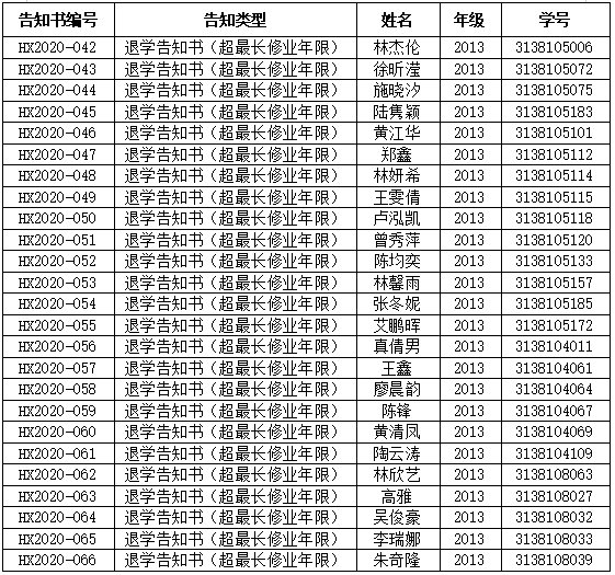 根据《成人影院 普通本科学生学籍管理实施细则》第十章第四十八条“学生有下列情形之一,可作退学处理:(二)不论何种原因在学校规定的最长修业年限内(含休学,不含应征入伍时间),未完成学业”的规定,以及《普通高等学校学生管理规定》(教育部令第41号)的相关要求,经核查,成人影院 林杰伦等25名学生自2013年9月入学至今,已超过6年在校修业年限,现依据学校退学处理流程,对林杰伦等25名学生发出《退学告知书》(超最长修业年限),并予以公示,名单如下: