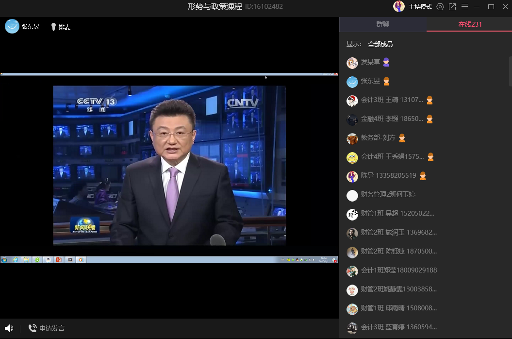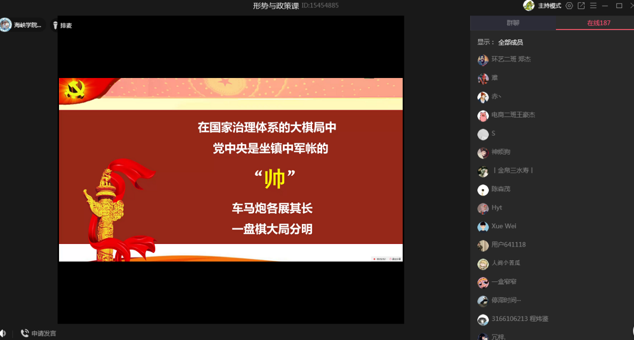 为进一步学习贯彻落实十九届四中全会精神,加强对毕业班学生的教育管理,近期,成人影院 党委张东昱书记、李廷旺副书记分别对2020届毕业生进行形势与政策课的线上授课。