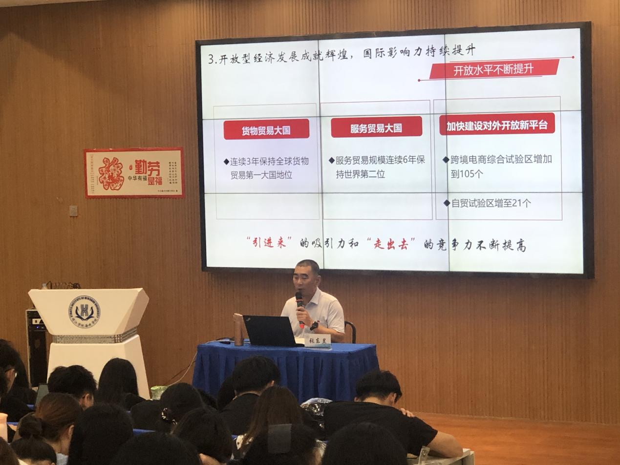 本次形势与政策课程分为两个主题。第一个主题为《收官“十三五” 实现新跨越》,张东昱书记从“决战脱贫攻坚取得决定性胜利”、“贯彻新发展理念、推进高质量发展迈出重要步伐”、“人民群众获得感、幸福感、安全感显著增强”和“中国共产党领导和我国社会主义制度优势进一步彰显”五个方面回顾了我国经济社会过去五年取得了全方位、开创性历史成就。他指出,站在新的起点上,我们要以一往无前的奋斗姿态、风雨无阻的精神状态,乘势而上开启全面建设社会主义现代化国家新征程,向第二个百年奋斗目标奋勇前进,确保“十四五”开好局、起好步。