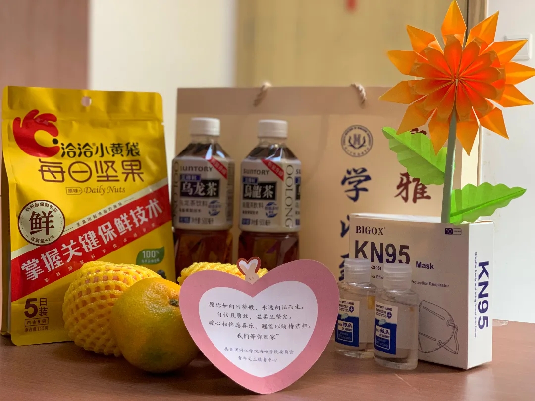 为配合做好疫情防控工作,学院共有21名学生暂时在闽院酒店进行健康监测。9月18日,学院党委为他们送上精心准备的防疫爱心大礼包,礼包内含防疫物资、饮料食品、水果、贺卡,以及手工制作的向日葵。礼轻情意重,隔离不隔爱。这是一场特殊的送温暖行动,也是一份来自海峡大家庭的关怀。