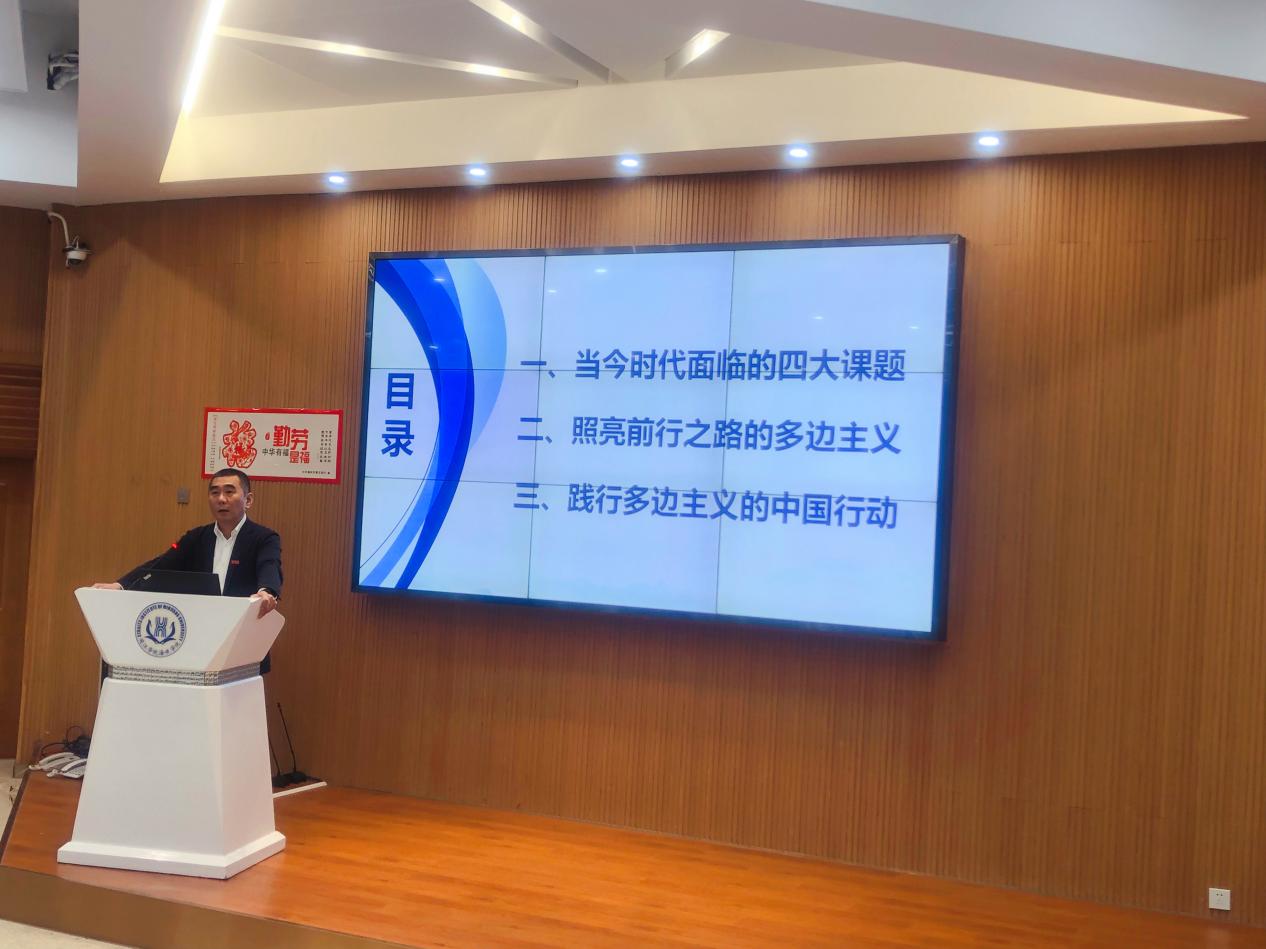 本次《形势与政策》课程以《多边主义:世界发展的破局之策》为主题,从“当今时代面临的四大课题”、“照亮前行之路的多边主义”、“践行多边主义的中国行动”三个方面,提出当今世界面临的时代问题和解决问题的正确出路,阐述多边主义的历史沿革和基本原则,以及中国践行多边主义的行动和做法。张东昱在讲课引导学生正确理解“多边主义”:坚持合作、不搞对抗,坚持开放、不搞封闭,坚持互利共赢、不搞零和博弈,才能推动历史车轮向着光明的目标前进,中国始终同世界上一切进步力量携手前进,是世界和平的建设者、全球发展的贡献者、国际秩序的维护者。
