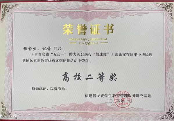 2024年1月19日,由福建省教育厅办公室主办的福建省铸牢中华民族共同体意识教育研讨会在福州大学图书馆顺利举行。开幕式上,主办方公布了此次福建省铸牢中华民族共同体意识教育优秀案例征集活动获奖名单,成人影院 获评优秀组织奖,成人影院 杨金发、林芬等2名教师合作完成的作品《青春实践“五合一”助力闽台融合“加速度”》获高校组二等奖。