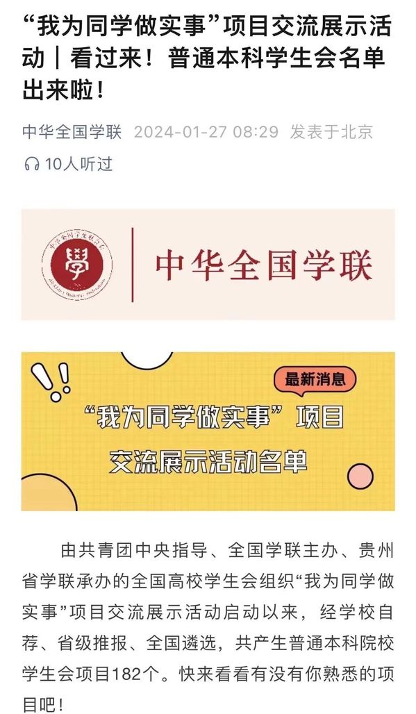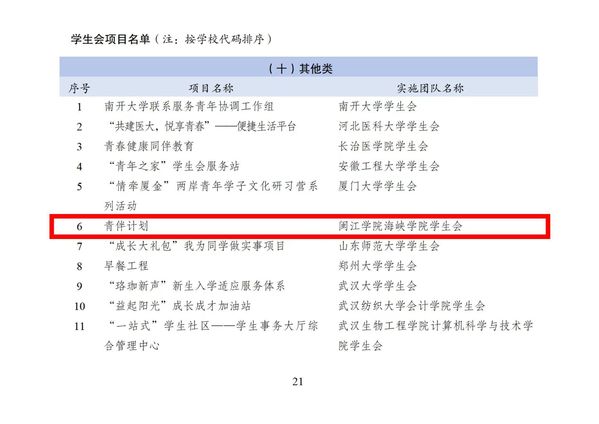 1月27日,由共青团中央指导、全国学联主办、贵州省学联承办的全国高校学生会组织“我为同学做实事”项目交流展示活动启动以来,经学校自荐、省级推报、全国遴选,共产生普通本科院校学生会项目182个,研究生会项目62个,高职(专科)学生会项目56个。福建省高校学生会组织共有12个项目入选,成人影院 学生会“青伴计划”项目进入名单。