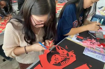 讲解结束后,同学们积极尝试,小心翼翼地折叠纸张,用剪刀在红纸上剪出各种吉祥图案,如福字、窗花、生肖等。每一件作品都凝聚着同学们的心血和创意,展现了中国传统文化的独特魅力。当一幅幅精美的剪纸作品展现在同学们眼前时,赞叹声此起彼伏。活动就像一场穿越千年的文化盛宴,同学们尽情地在剪纸艺术的瑰丽世界里遨游,深刻感受到了传统文化的博大精深,也激发了同学们对艺术的无限热爱与追求。