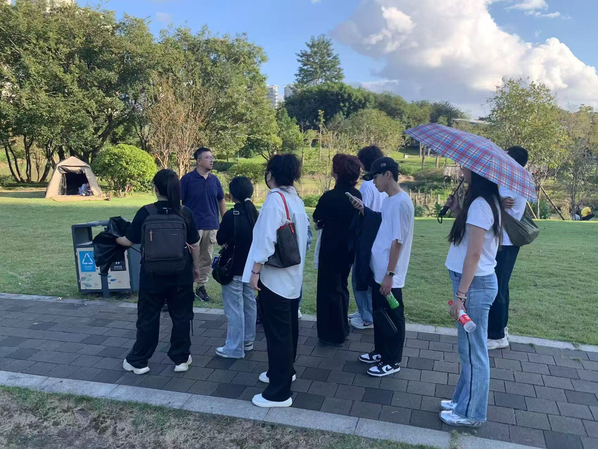 随后,师生们步行来到鹤林公园,高屹老师一边为同学们介绍公园中的各个设施,一边为同学们讲授“设计心理”方面的专业性知识:包括但不限于设计给人的感官刺激,规划空间的安全感与私密性,以及在设计过程中如何围绕“人性化”进行全面考虑。其中,高屹老师着重围绕“桥洞空间”和“植物高度分布”进行讲解。他告诉同学们,景观项目的布置要有疏有密才不至于单调:上下的高低程度,左右的宽窄程度都能在很大程度上影响游玩者的心理感触,更能表达出不同的设计情感。为同学们指明了学习方向,使同学们受益匪浅。
