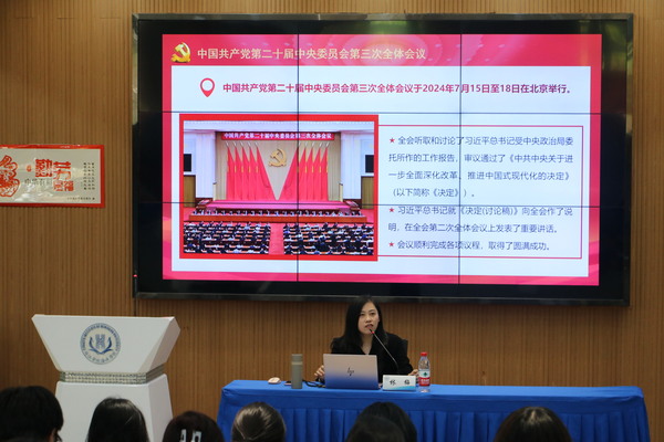 课上,林梅老师围绕“深刻理解党的二十届三中全会的重大意义”“深入学习领会习近平总书记的重要讲话精神”“全面准确理解《决定》提出的重大举措”“全力以赴抓好全会精神贯彻落实”等方面,详细阐述了全会精神的核心要义和精神实质。林梅老师寄语同学们在今后的学习和工作中,要积极关注国家发展大局,为实现中华民族伟大复兴贡献自己的力量。