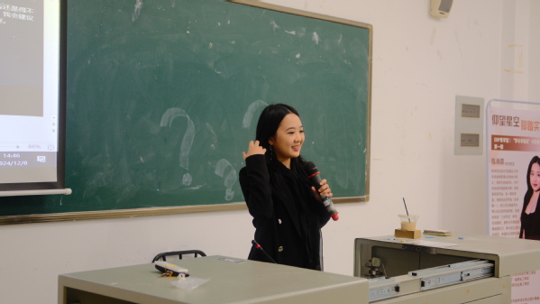 陈雨露以“仰望星空,脚踏实地”为主题,进行了一场精彩纷呈的分享会。她详细分享了个人的学习经历、实习经历及赛事经历,鼓励学弟学妹们做到精进学业、夯实基础、多元成长,文体兼修,同时还建议学弟学妹们在面对多种选择时,要勇于尝试以找寻到自己最感兴趣的那条路。