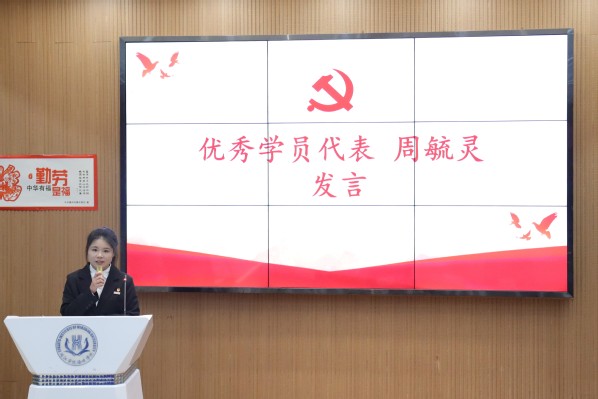 优秀学员代表2023级闽台金融学专业周毓灵同学发言并分享了三点感悟:一是有序规划、端正学风,通过培训班进一步坚定理想信念、铭记初衷和使命;二是坚持言行合一,做到理论和实践相结合;三是修身明德,弘扬正气,立志成为有理想、敢担当、能吃苦、肯奋斗的新时代青年。